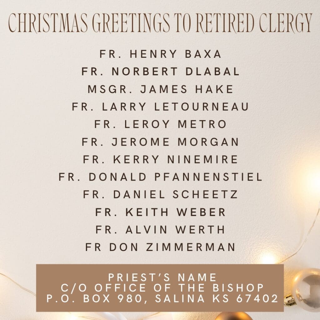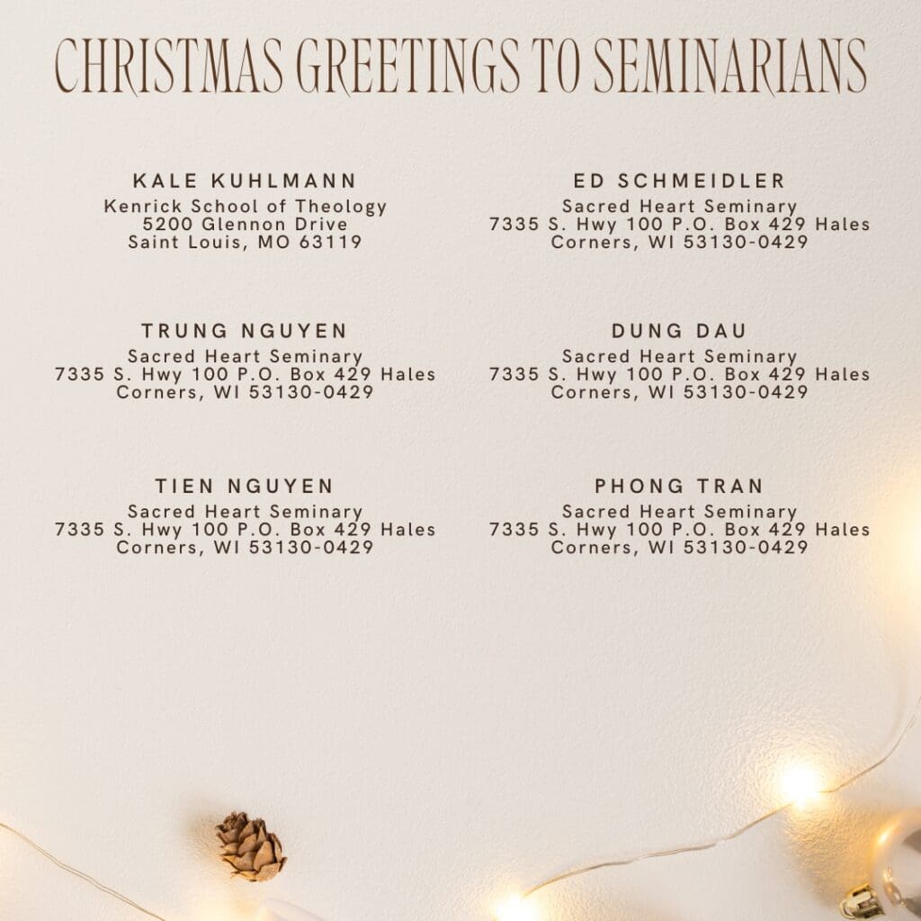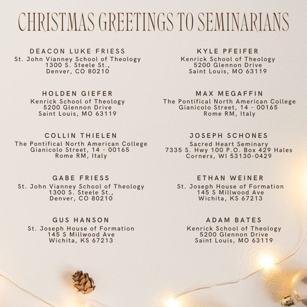 Wanting to send Christmas greetings to our seminarians and retired clergy? View their information below to see where you can send them some mail this holiday season!