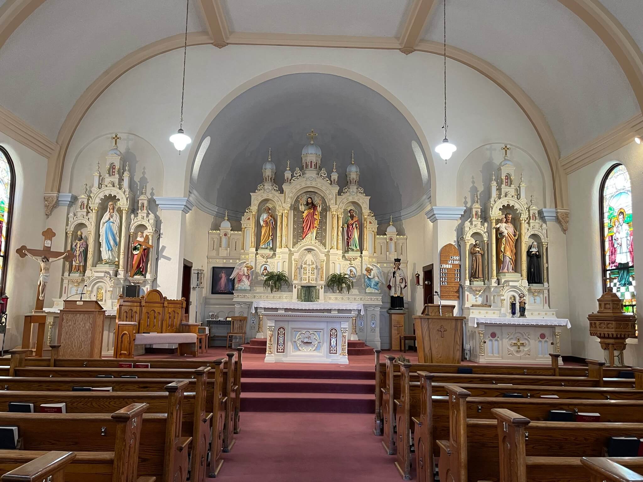 Now, over 100 years after Joseph Kanak came to Northwest Kansas from Wisconsin, to install the original altars in St. John’s, his great-grandson, Jordan Hagler, and his grandson, Vince Kanak, built a new altar of sacrifice for St. John’s as a larger altar was requested by a few priests. The original communion railing doors were used to build the new altar, featuring a lamb on one door and a pelican on the other. The lamb represents Jesus, the Lamb of God. The pelican is a symbol for Christ as the pelican was believed to have pecked her own flesh to feed her starving chicks. This is a symbol of Christ as he feeds us with his body and blood in the Eucharist.