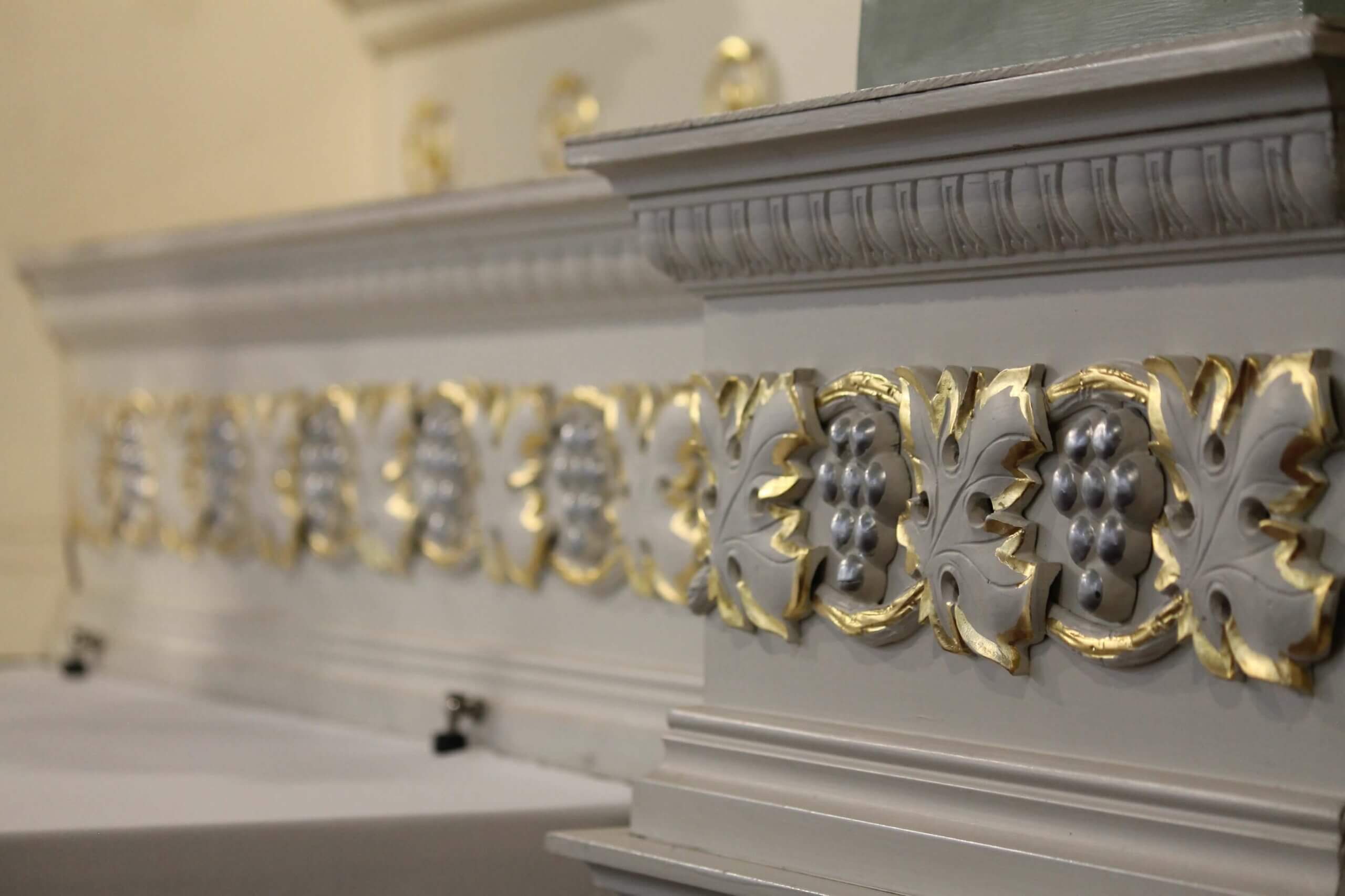 Once the main body of the altar was built, arches were built out on each side to match the original altars. The design on the top of the altar matches the design on the high altar. The base mold trim was custom made to match the original base trim. The emblems, columns, and on lays on the high altar were replicated and added on to the new altar.