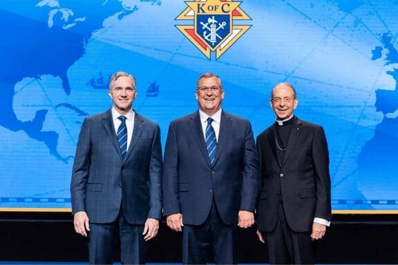 Newly elected Supreme Director Jamey Roth, immediate past state deputy of Kansas, with Supreme Knight Patrick Kelly and Supreme Chaplain Archbishop William Lori.
