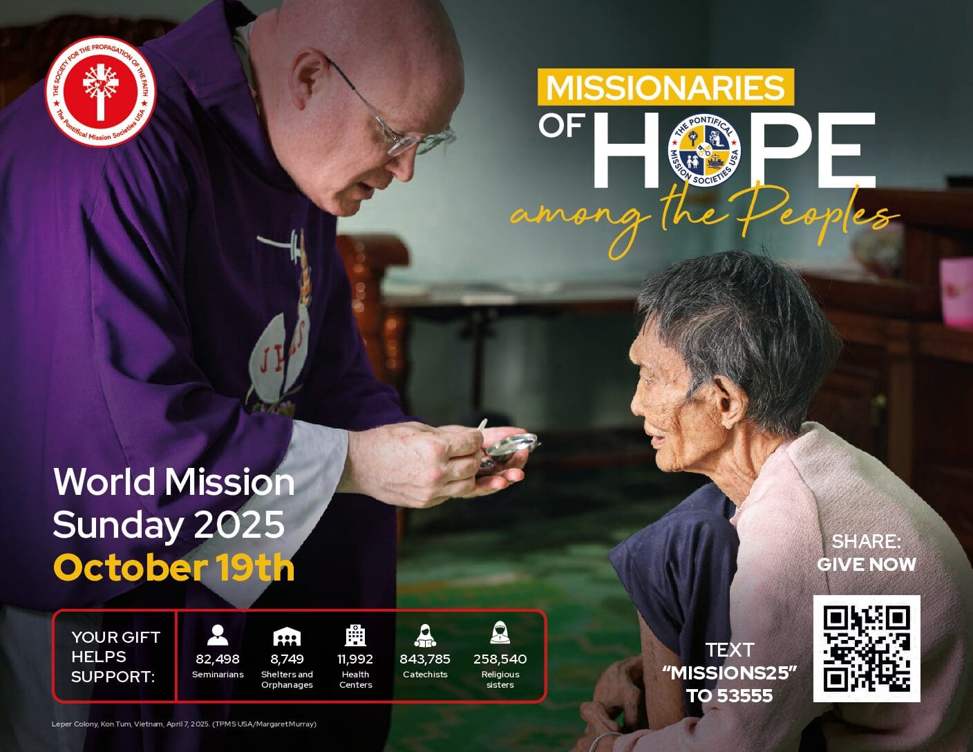 World Mission Sunday, our annual worldwide Eucharistic celebration for the Missions and missionaries of the world, will be celebrated on October 19, 2025. This collection held on the next-to-last Sunday in October is a unique, global effort for the entire Church to provide for the building up of over one thousand local churches in Asia and Africa, the Pacific Islands, and parts of Latin America and Europe. Through the work of these churches, and their witness to Christ, the poor receive practical help and experience God’s love and mercy, His hope and peace.