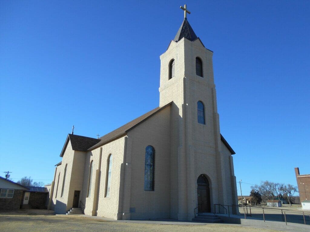After Bishop Scannell was named Bishop of Omaha, parishioners agreed neither parish could survive without a pastor, and so they asked the interim administrator of the diocese, Wichita Bishop John Hennessy, to send a priest. He did so, and the priest lived in Herndon and attended to both churches. The next pastor assigned in 1892 wasn’t as agreeable and merged the congregations under the name Assumption of the Blessed Virgin. The rural church was moved to town and served as a parochial school.