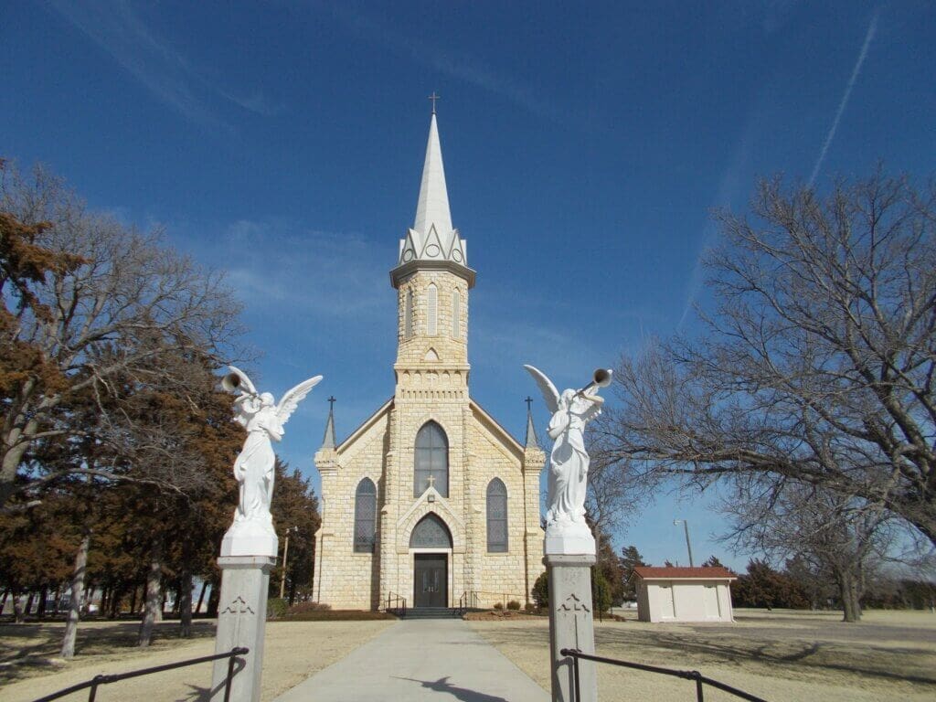 German emigres from Russia arrived in 1876 and soon were served by a priest traveling from Salina. Later, one of the pioneer priests of the diocese, Father Valentine Sommereisen, celebrated Mass in settlers’ homes, but because his territory followed the railroad all the way to the Colorado line, his visits were infrequent. In between, villagers gathered at the town cross to prayers.