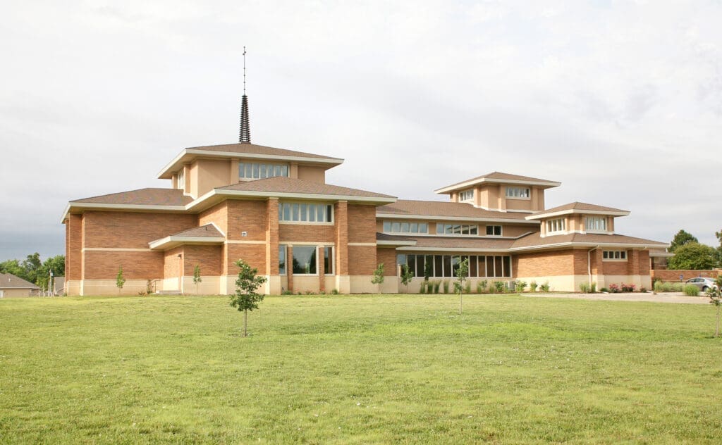 The new church, reminiscent of Frank Lloyd Wright architecture, was dedicated in January 2007. It is connected to the old church, with the renovated main floor containing a new parish hall and kitchen.
