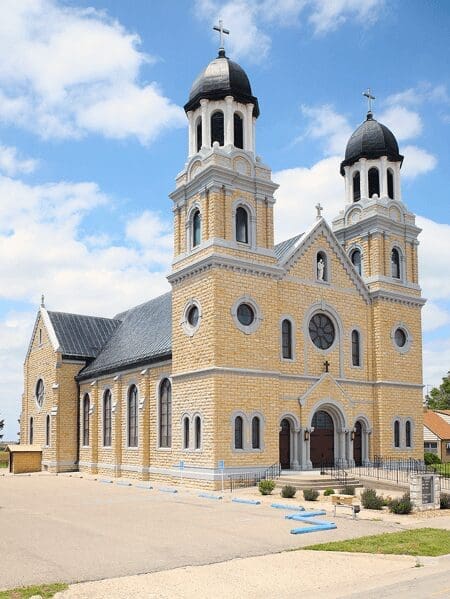 By 1912, the congregation had outgrown that small church, and plans for a grand Romanesque church were started. Limestone was quarried and shipped from Waldo, about 50 miles to the east, and parishioners provided most of the labor, making the ambitious feat possible.