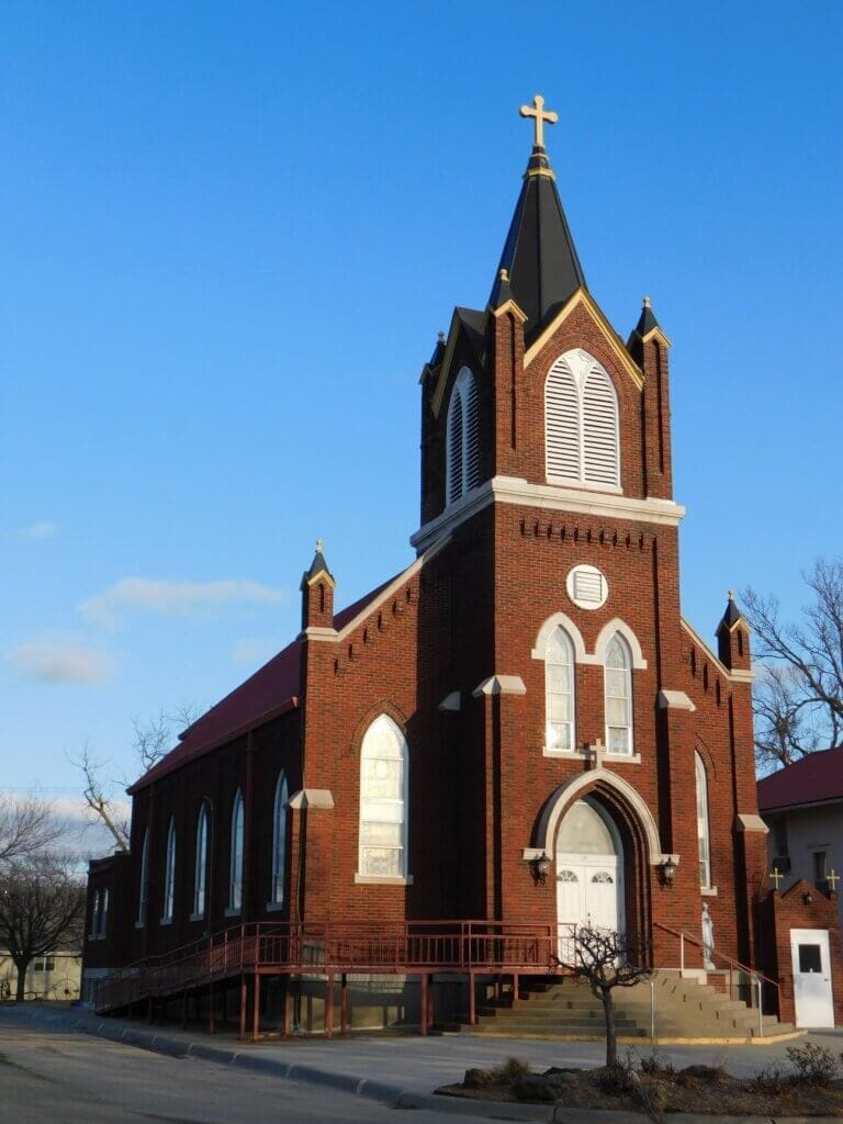 Catholic settlers arrived in 1859 and settled at what was called Parsons Creek. After three years, two of the original pioneers, Nicholas Schumaker and Nicholas Esslinger, traveled to Leavenworth to ask Bishop John Miege to send them a priest. He promised to do so, either from Atchison or the Jesuits’ Indian mission at St. Mary’s. Residents built a log cabin in 1865 that served as both a church and school.